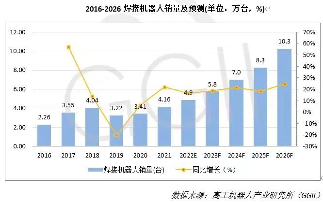 高工机器人产业研究所(GGII)统计数据显示,2021年中国市场焊接机器人销量4.16万台,同比增长21.99%,同时GGII预计,到2026年,中国市场焊接机器人销量或将突破10万台大关。