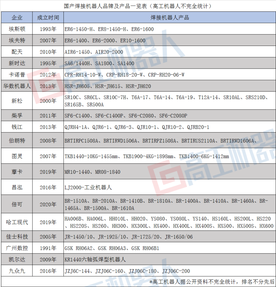 另附上国产焊接机器人品牌及产品一览表: